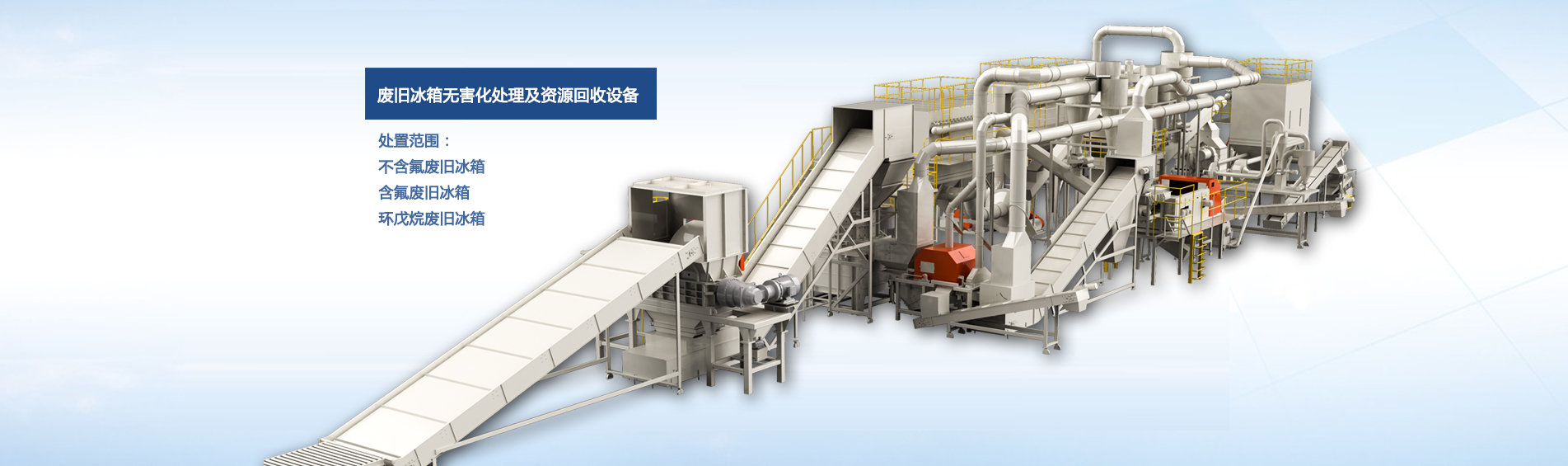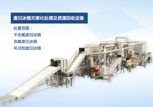 公司自主研發(fā)的廢舊冰箱無(wú)害化處理及資源回收技術(shù)及設(shè)備, 獨(dú)具 “雙軸撕碎機(jī)+立式破碎機(jī)+大風(fēng)量稀釋環(huán)戊烷氣體”的專(zhuān)利組合設(shè)計(jì), 主要用于對(duì)廢舊冰箱中的各種原材料進(jìn)行分離、 回收和利用, 具有自主知識(shí)產(chǎn)權(quán), 經(jīng)國(guó)家工業(yè)和信息化部科技成果鑒定為 “填補(bǔ)國(guó)內(nèi)空白, 達(dá)到國(guó)際先進(jìn)水平” 。