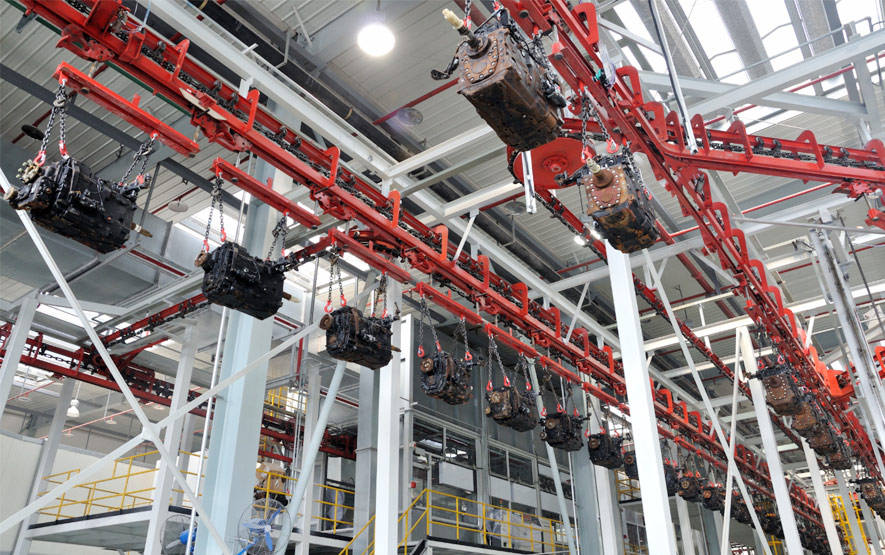總成組裝自動線,客車、卡車變速器混線智能化裝配智能裝配高節(jié)拍流水線,不僅加工效率高、精度高,而且杜絕了加工中等待時間,實現(xiàn)了加工過程各工位的步調(diào)一致。實現(xiàn)客車、卡車系列變速器混線自動裝配。超過10公斤的分總成均采用機器人全自動入箱,所有螺栓擰緊工作由機械手全程負責。通過RIFD系統(tǒng)自動讀取變速器型號,采用MES生產(chǎn)管理系統(tǒng),自動讀取各工位裝配信息并采集裝配過程數(shù)據(jù),再結(jié)合自動對齒機和自動測量機實現(xiàn)整個裝配過程的自動和智能化。裝配線有19項專利,獲多項裝配技術(shù)獎。工序?qū)嵤┰诰€質(zhì)量控制,確保品質(zhì)一致。